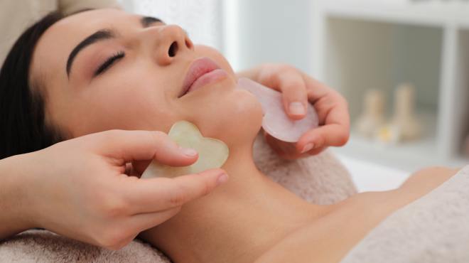 Puis elle procèdera à un massage harmonisant avec l'aide d'un Gua Sha en quartz rose. Le glissement de la pierre sur le visage lisse les traits, stimule la régénération et renforce les effets drainants.